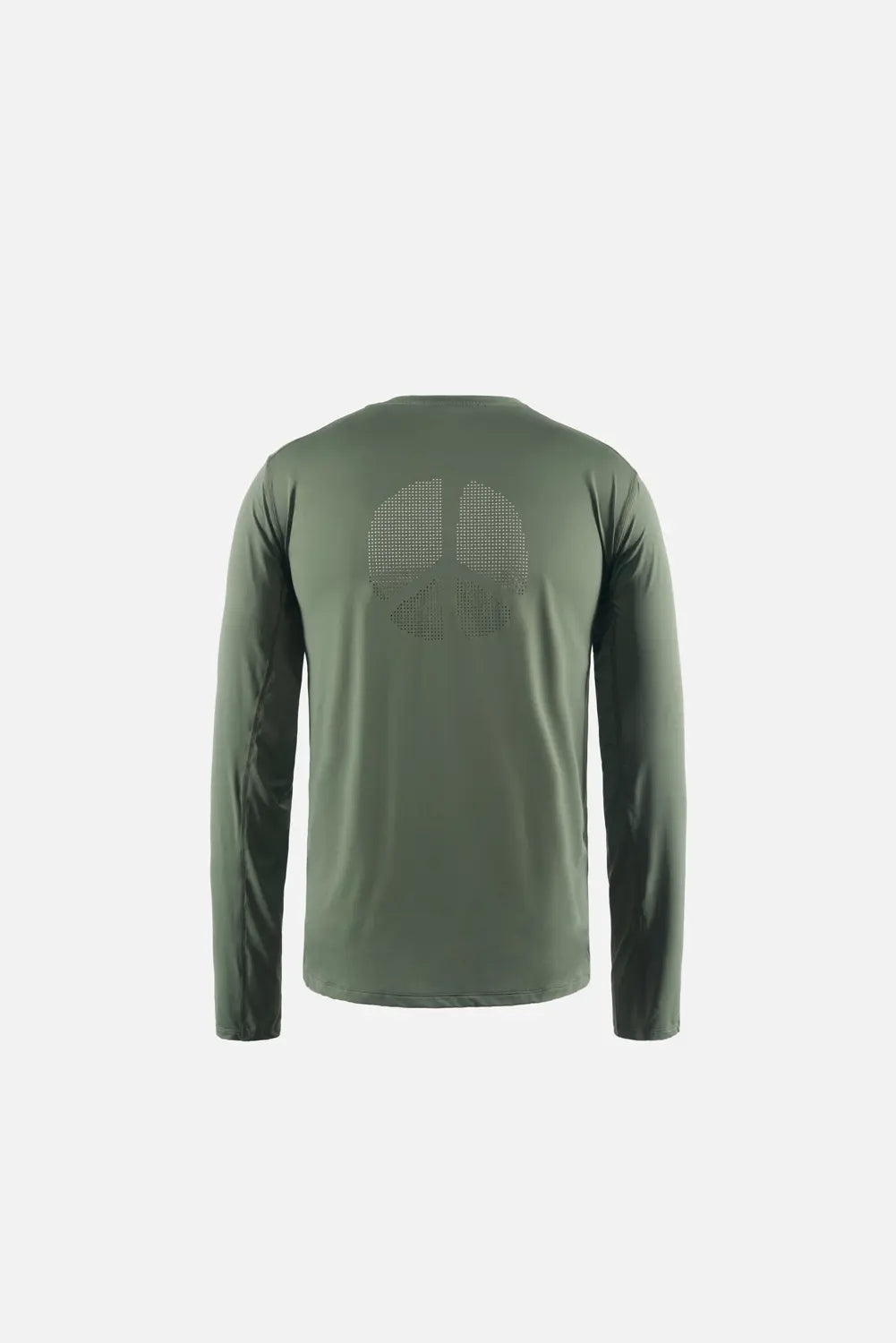 The ultralight aloe base layer program is our lightest and highest performance shirting offering. During the extrusion process, aloe vera molecules are integrated into the nylon fibers, constructing a soft 100g stretch fabric. Additionally, laser-cut peace sign iconography on the rear of the shirt aids in ventilation and body heat management during high-output activities.