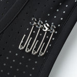 Our micro jersey fabric is knitted and perforated in Italy. It naturally stretches in every direction following the body's movements while staying breathable. It's created using a laser microperforation technique called punch-out, which removes portions of fabric leaving micro-holes. This allows greater breathability and lighter weight while also providing an easy way to attach your number on race day.