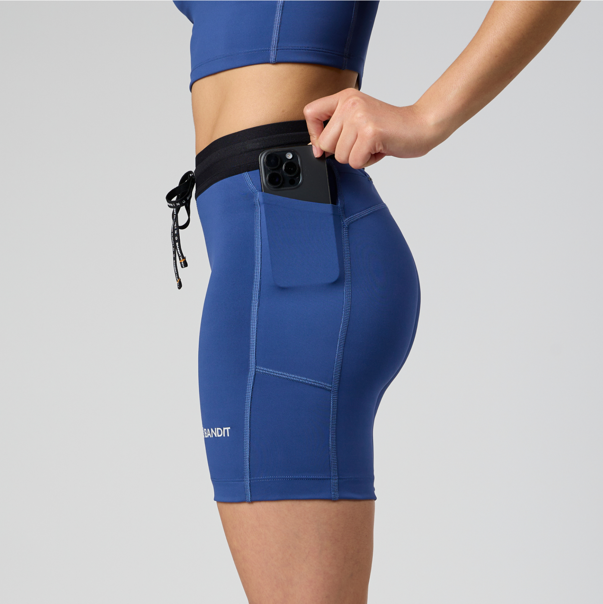 Our best-selling women's compression in 7" Bandit Black. Stamina™ is an all-way stretch fabric, engineered to seamlessly move with your body. Dual anti-bounce side pockets for your phone and a clean back zipper pocket for keys and cards. Italian Framis grip tape at front and back bottom hem to prevent any riding up without squeezing you. Finished with subtle reflective logos at front and back and a custom waistband with branded drawstring and contrast Taxi bartack.