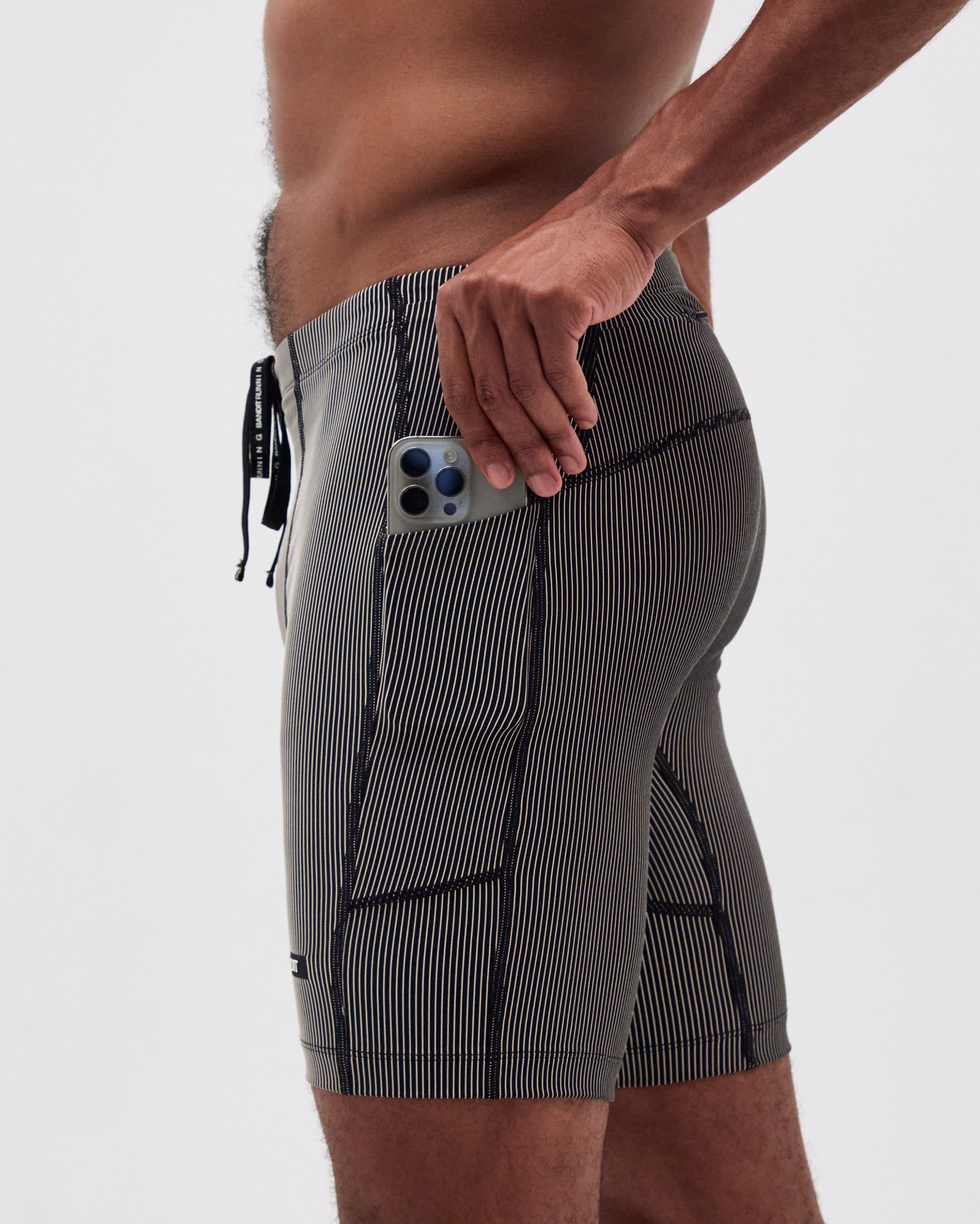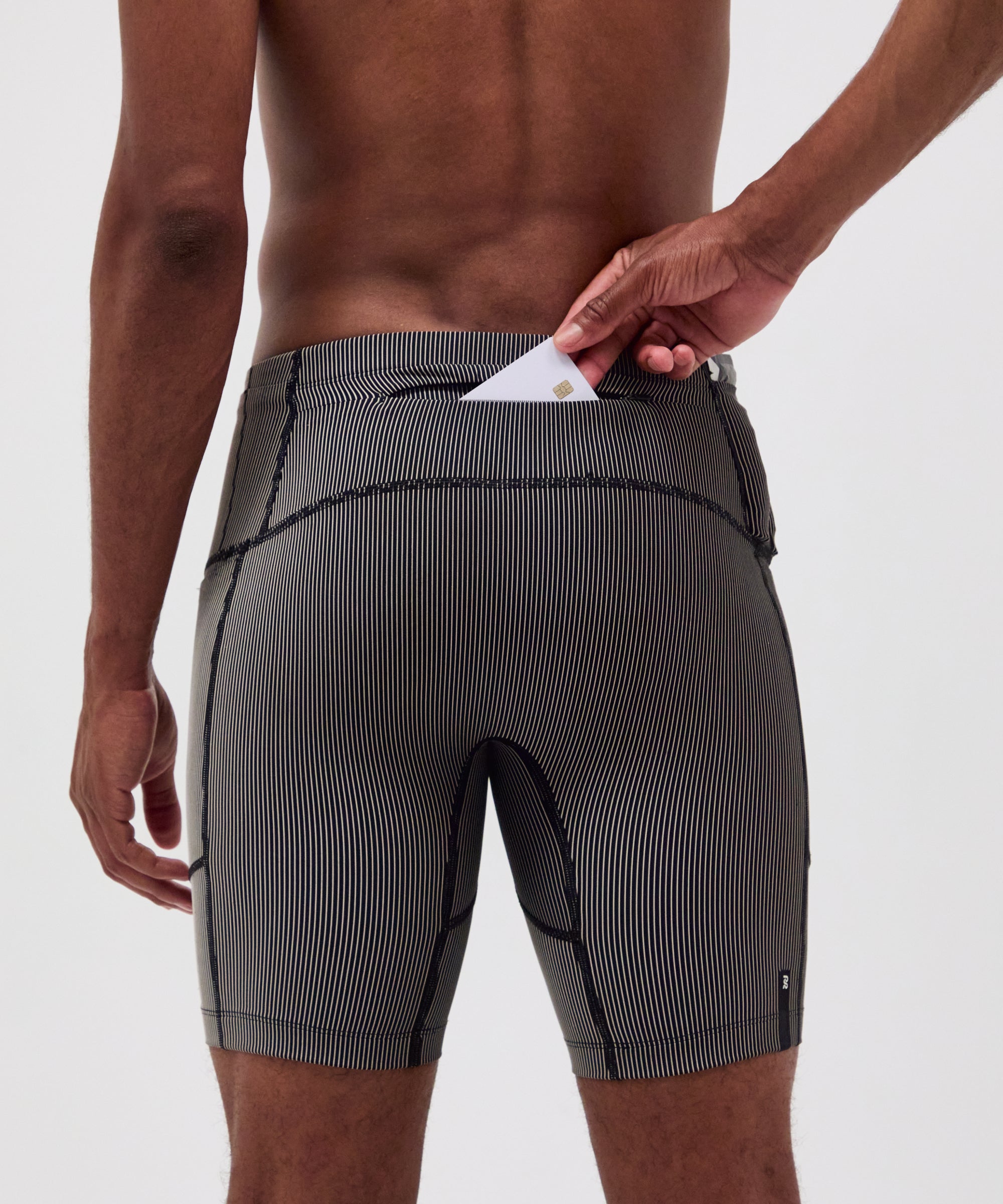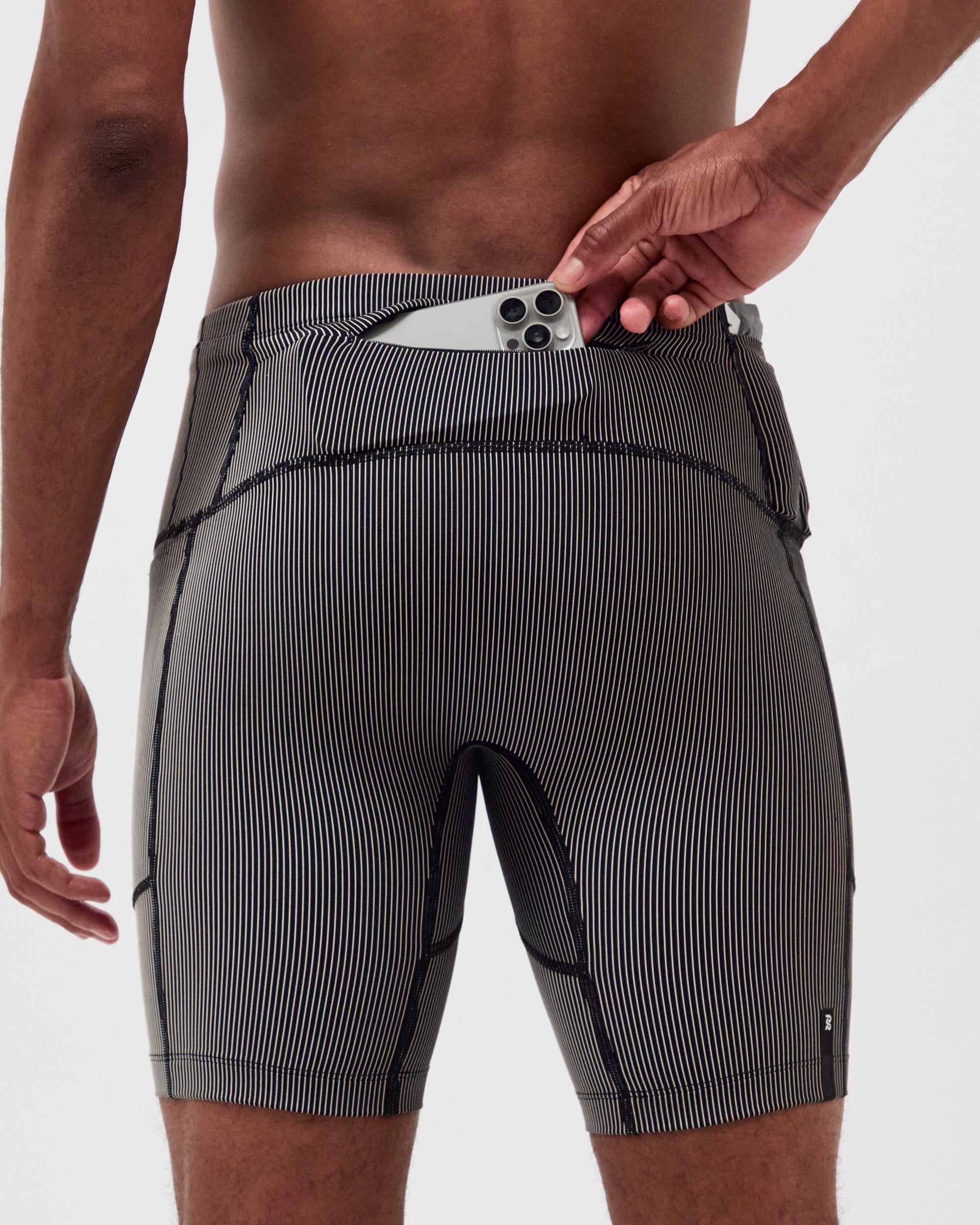 The Next Gen Half Tight in our ribbed Striped Cadence™ fabric, with an optimized gusset, offers 7 pockets: 2 iPhone-sized with waterproof liners, 4 gel-sized, 1 zippered stash. Italian grip tape prevents ride-up, with double-layered front fabric, a drawstring, silicone patch and clamp at wearer's right back leg. New S25 colorway.