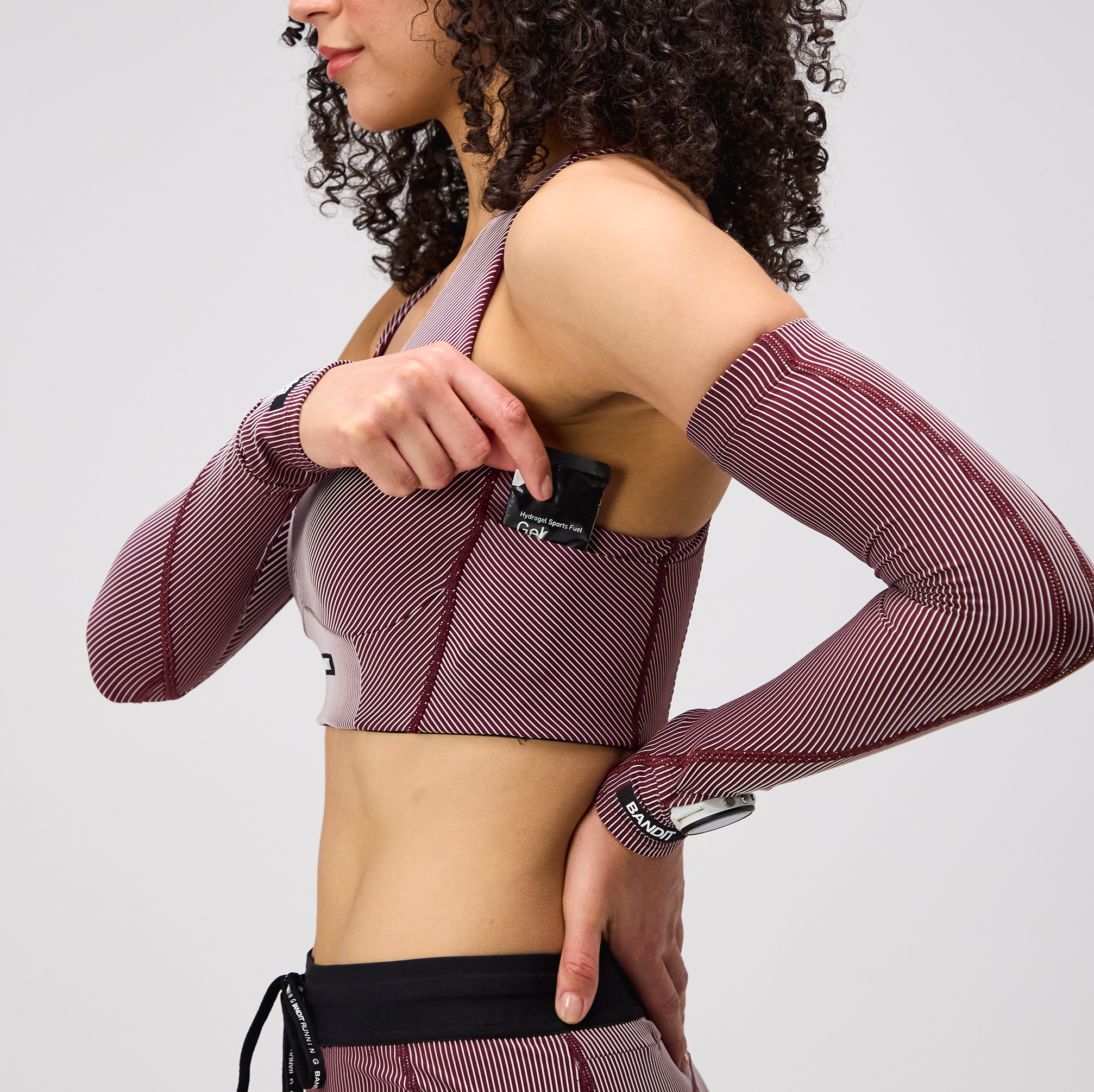 - 5 pockets: 2 for gels under each arm, 2 additional stash pockets at the side back body, and 1 for iPhone at center-back