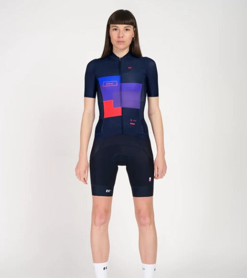 - Dark Navy color with a grid-flag graphic of blue, violet, and red with pixel destruction details and WWC typography