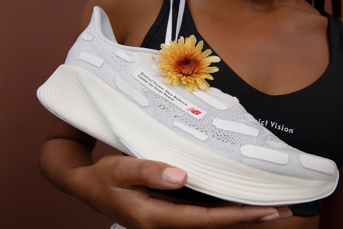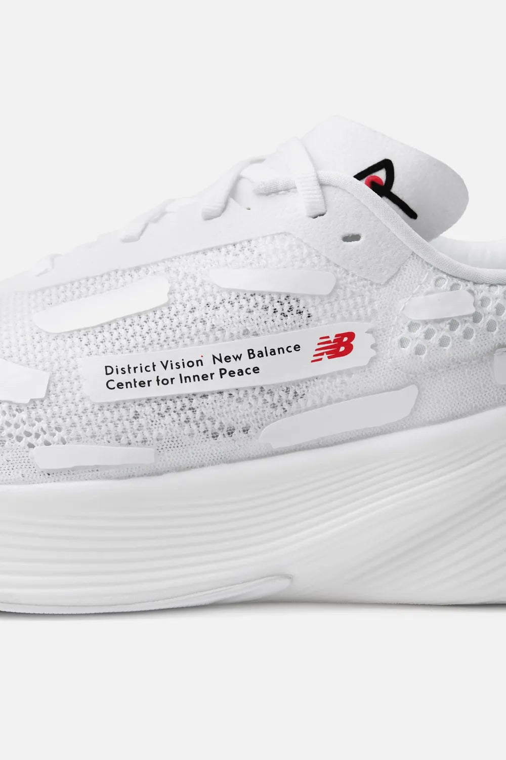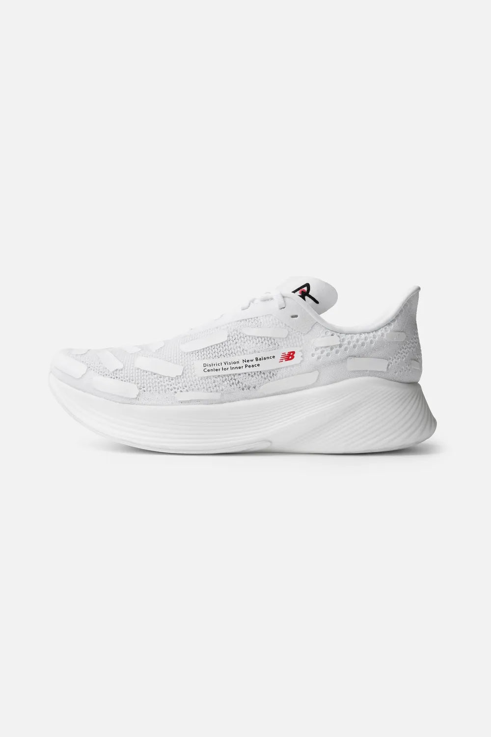 The District Vision + New Balance FuelCell RC Elite v2 is designed for peak performance in road running settings. FuelCell foam paired with a full-length, carbon fiber plate increases energy return and propulsion. A mid-foot cutout and strategically placed lightweight outsole rubber decrease the overall weight of the shoe while providing durability and traction where needed. The shoes feature an approximate 8mm drop, a lightweight and breathable knit upper overlaid with original artwork by Filip Pagowski, and an adjustable lace closure for a customized fit.
