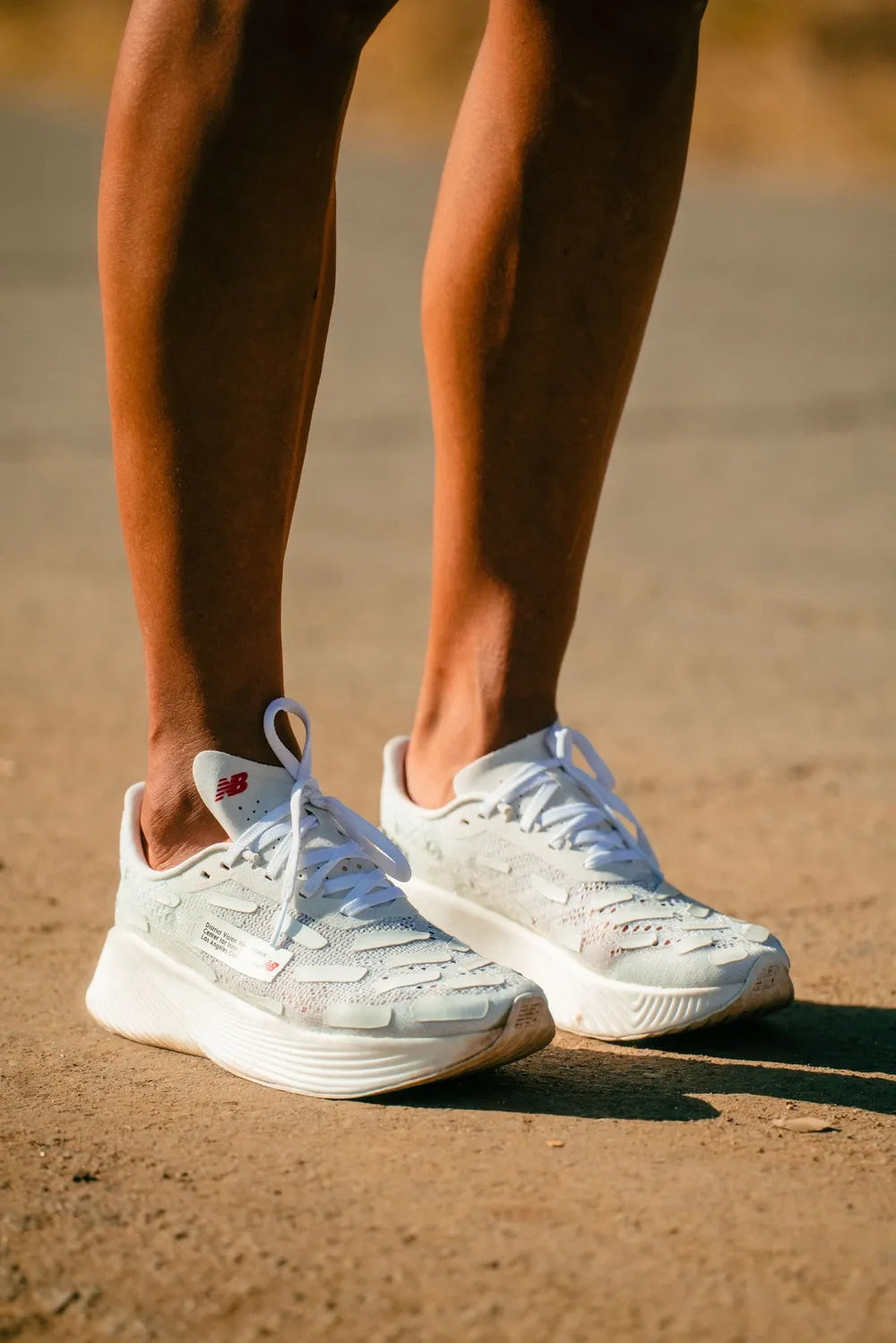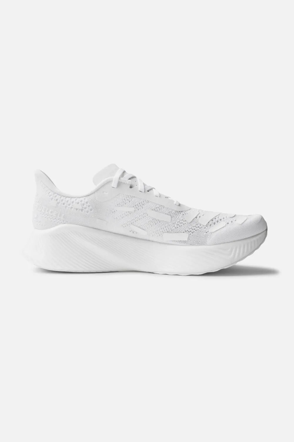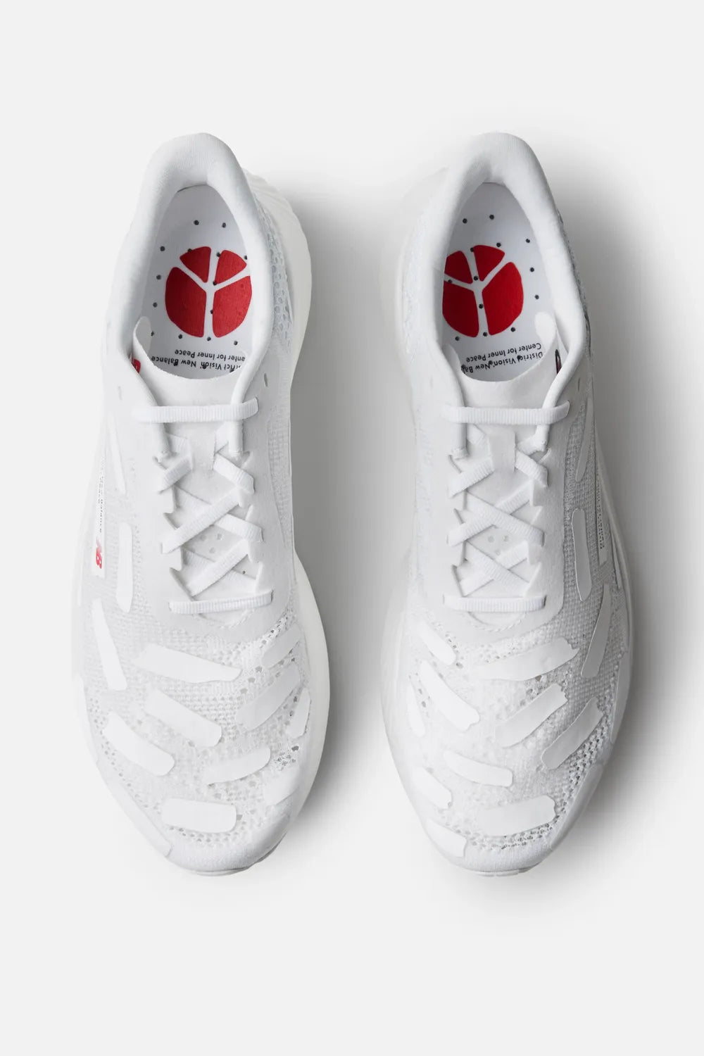 The District Vision + New Balance FuelCell RC Elite v2 is designed for peak performance in road running settings. FuelCell foam paired with a full-length, carbon fiber plate increases energy return and propulsion. A mid-foot cutout and strategically placed lightweight outsole rubber decrease the overall weight of the shoe while providing durability and traction where needed. The shoes feature an approximate 8mm drop, a lightweight and breathable knit upper overlaid with original artwork by Filip Pagowski, and an adjustable lace closure for a customized fit.