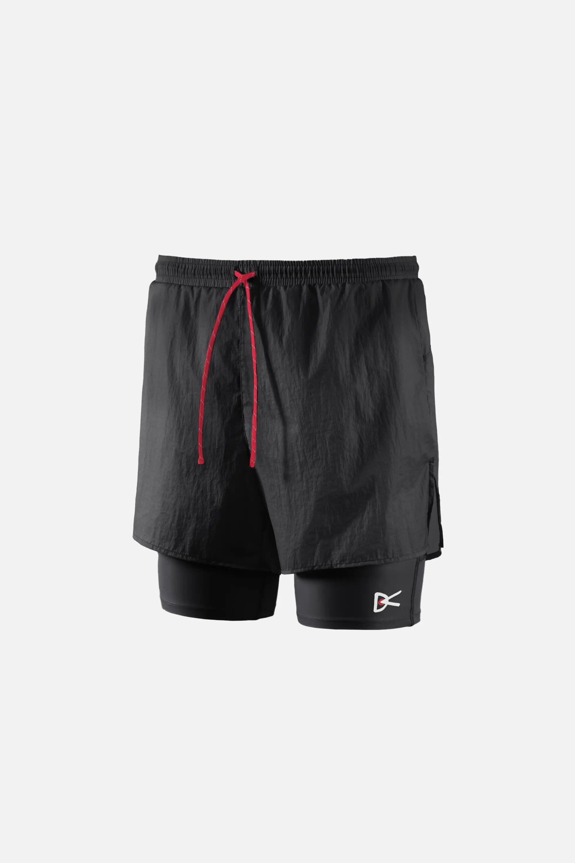 The ripstop layered trail shorts unite our recycled half tights with a 5" ultralight Italian-milled micro-ripstop nylon shell, a concealed phone pocket under the outer shell of the shorts, a secure rear technical zip pocket, roomy powermesh pockets on either side for nutrition and other essentials, a discrete key pocket sewn into the waistline, and substantial drawcords for a secure and customizable fit.