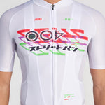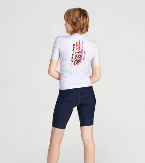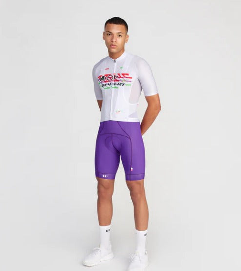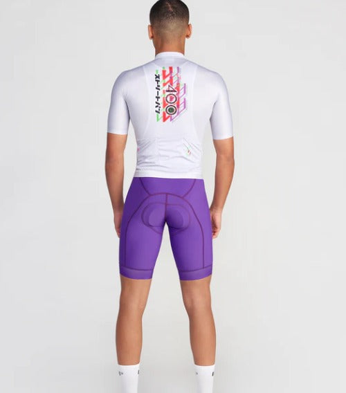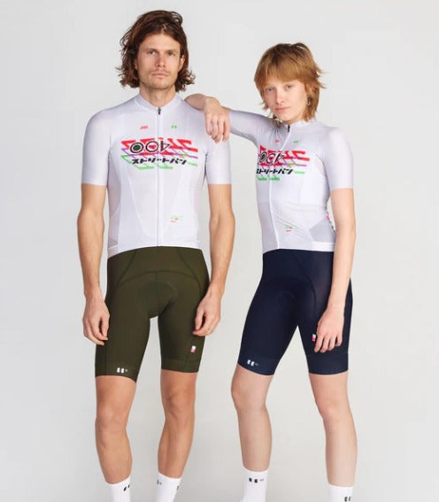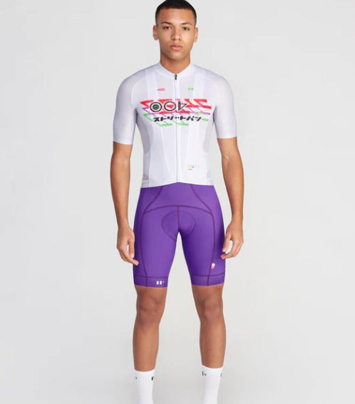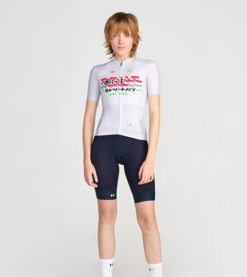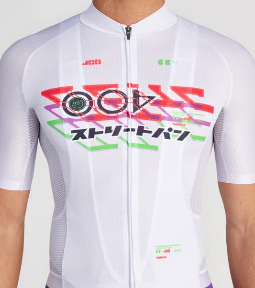 เสื้อเจอร์ซีย์แบบแอโรไดนามิกที่โปรโมต Streetpan 400 ที่มีการเคลื่อนไหวความเร็วสูง 4 สต็อป การพิมพ์ที่ซับซ้อนนี้ยกย่องกล้องกลไกในจินตนาการของสีนีออนเจเนซิสเกี่ยวกับฟิล์มขาวดำ